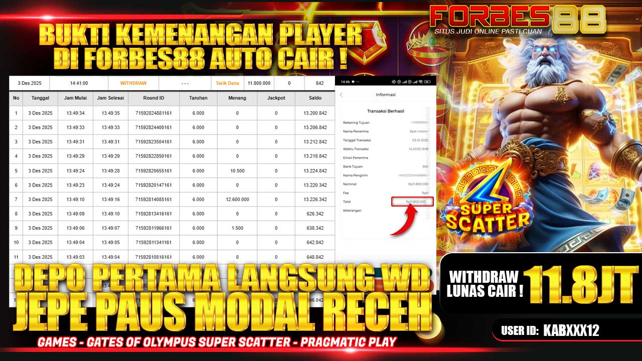 Keberuntungan besar langsung dirasakan member FORBES88 pada deposit pertama melalui permainan Gates of Olympus Super Scatter. Dengan modal receh, kemenangan berhasil terkumpul hingga 11,8 juta rupiah. Proses withdraw terbukti cepat, aman, dan langsung cair, memperlihatkan sistem pembayaran yang transparan.