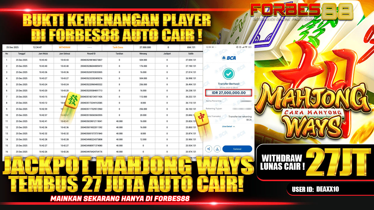 Kemenangan besar kembali terjadi di FORBES88 melalui permainan Mahjong Ways. Seorang member berhasil menembus jackpot hingga 27 juta rupiah dengan proses withdraw yang cepat dan aman. Bukti transaksi menunjukkan sistem pembayaran berjalan lancar, transparan, dan langsung cair ke rekening tanpa hambatan.